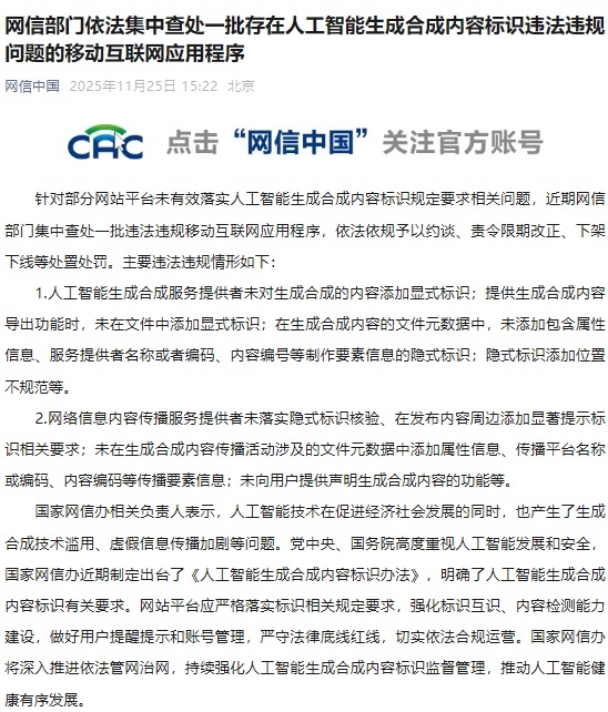 針對部分網站平臺未有效落實人工智能生成合成內容標識規(guī)定要求相關問題,近期網信部門集中查處一批違法違規(guī)移動互聯(lián)網應用程序,依法依規(guī)予以約談、責令限期改正、下架下線等處置處罰。主要違法違規(guī)情形如下: