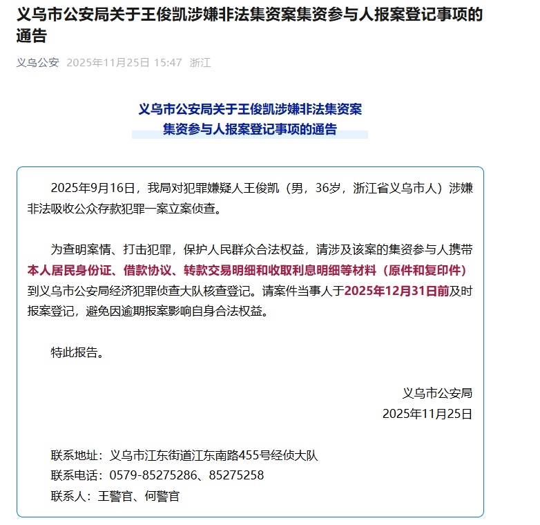 11月25日,義烏市公安局發(fā)布通告:2025年9月16日,我局對犯罪嫌疑人王俊凱(男,36歲,浙江省義烏市人)涉嫌非法吸收公眾存款犯罪一案立案偵查。