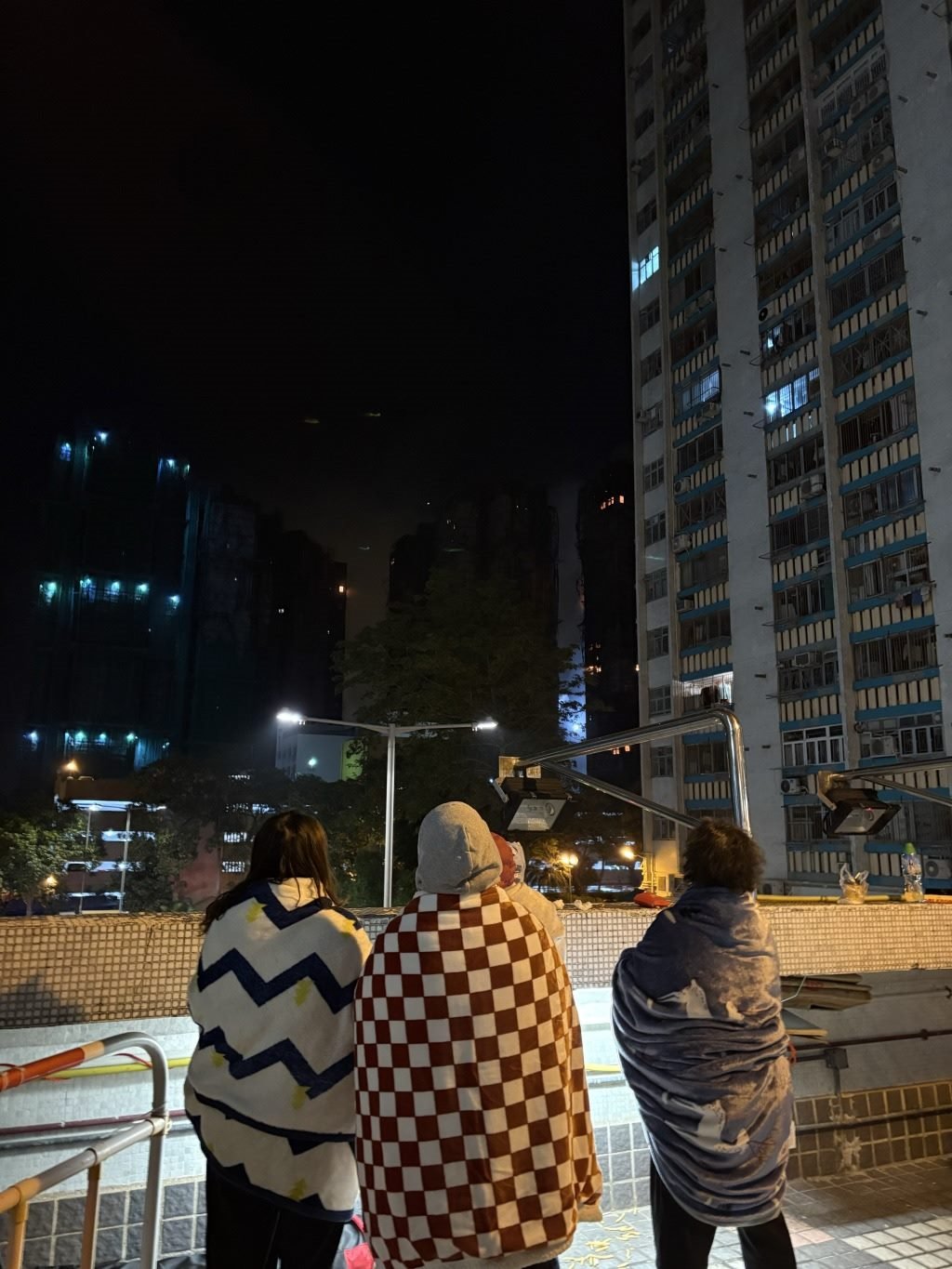 受此次火災(zāi)影響,宏福苑小區(qū)及周邊緊鄰樓棟居民被暫時(shí)疏散,其中一些人選擇在廣福商場(chǎng)二層的露天廣場(chǎng)過夜,那兒可以看到火情,有的人裹著毛毯,著火的高樓在他們眼中映出火光,有人一盯就是一整晚。其中便有家在宏福苑宏志閣28樓的張女士,26日下午4點(diǎn),她刷到火災(zāi)新聞后立馬給60多歲的母親打了電話,母親告訴她,外邊黑煙太大,跑屋里了,出不去,只能關(guān)緊門等救援?!爱?dāng)時(shí)好像火還沒燒到我家那棟樓”,等她報(bào)了警趕到家,樓已起火,之后,她沒能再撥通母親的電話。