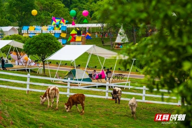 在景區(qū)內(nèi)看到,幾頭黃牛在圍欄內(nèi)悠閑踱步,遠處白色帳篷點綴草地,彩色氣球懸空,標識牌上寫著“草原音樂狂歡節(jié)”。這一幕,成為景區(qū)從“田園牧歌”走向“時尚秀場”的縮影。