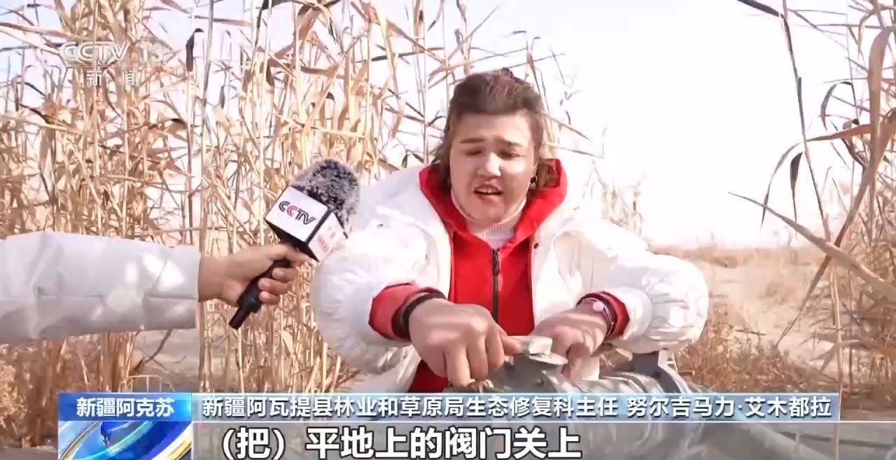 新疆阿瓦提縣林業(yè)和草原局生態(tài)修復(fù)科主任 努爾吉馬力·艾木都拉:把平地上的閥門關(guān)上,然后把全部壓力給到高處沙包上的滴灌管道。再生水來了,水源充足以后,現(xiàn)在成活率達(dá)到75%以上了。