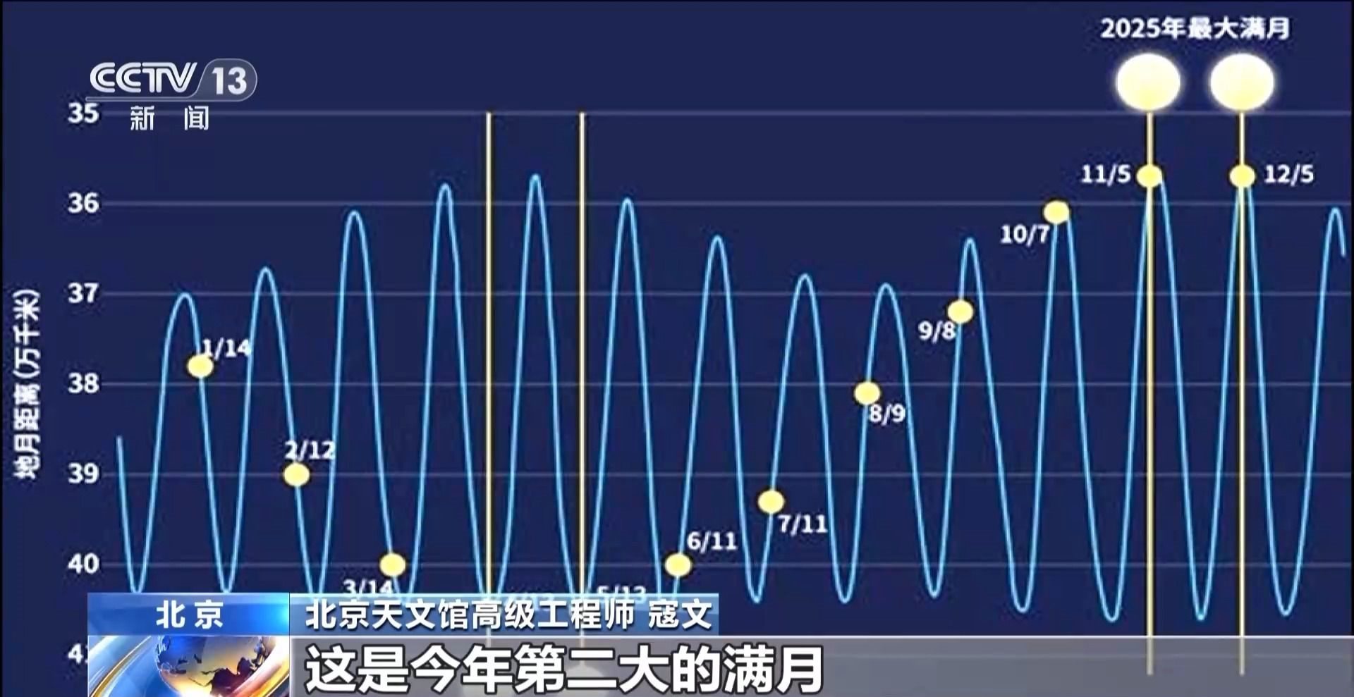 北京天文館高級工程師 寇文:12月5日大約早晨7點(diǎn)14分是滿月,而月亮過近地點(diǎn)的時(shí)間是在這之前大約12個(gè)小時(shí),這是今年第二大的滿月,也可以算是一次“超級月亮”。
