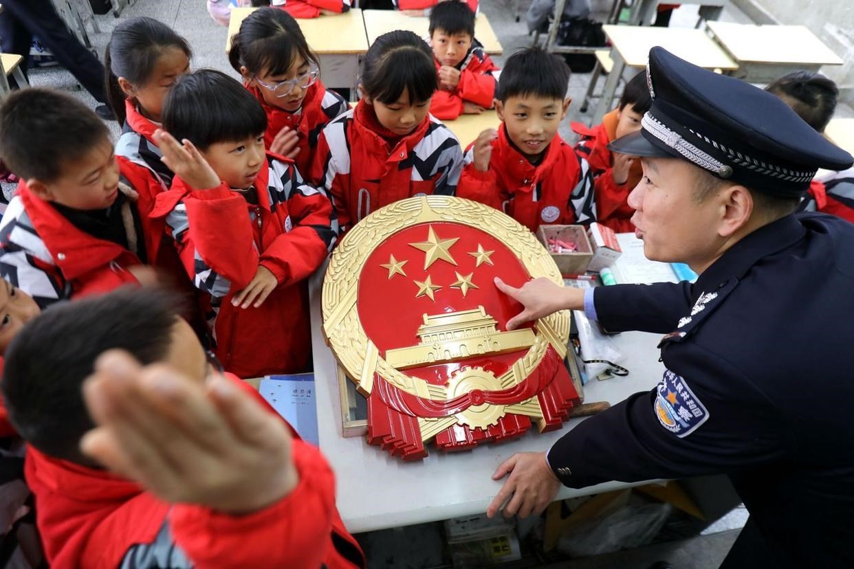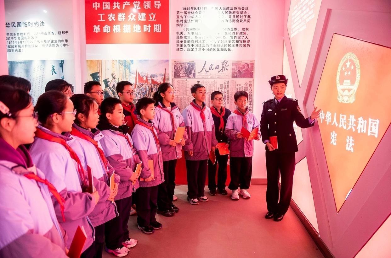 12月4日,民警在江蘇省泰州市海陵區(qū)九龍實(shí)驗(yàn)學(xué)校給學(xué)生講解憲法知識(shí)。當(dāng)?shù)?,通過(guò)咨詢、普法課堂等多種形式開(kāi)展憲法宣傳教育活動(dòng),弘揚(yáng)憲法精神,提升公民法治素養(yǎng)。(工人日?qǐng)?bào)通訊員 湯德宏 攝)