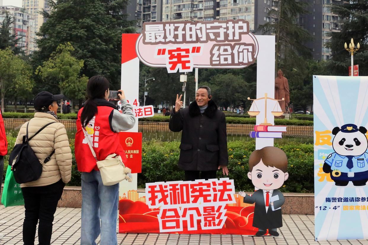12月4日,四川省樂(lè)山市市中區(qū)司法局普法宣傳志愿者在樂(lè)山新廣場(chǎng)開(kāi)展“憲法宣傳日”活動(dòng),市民在法治打卡框合影留念。(工人日?qǐng)?bào)通訊員 李華時(shí) 攝)