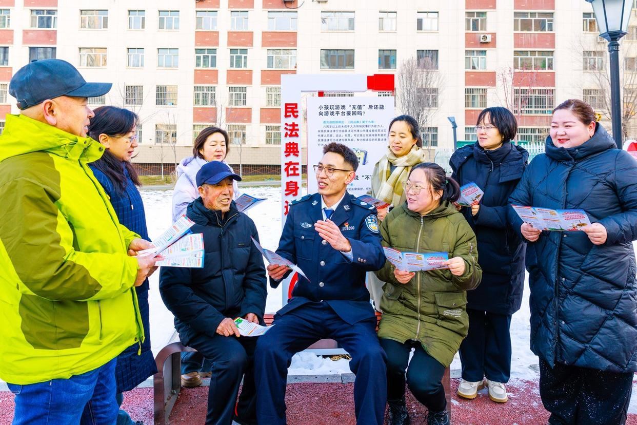 12月2日,安徽省馬鞍山市含山縣公安局林頭派出所聯(lián)合鎮(zhèn)司法所,將“法治課堂”搬進(jìn)菜市場(chǎng)門口,向過(guò)往群眾講解《中華人民共和國(guó)憲法》《中華人民共和國(guó)民法典》等法律法規(guī)。(工人日?qǐng)?bào)通訊員 馮善軍 攝)