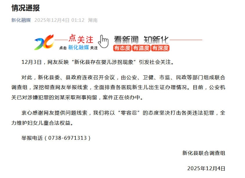 中新網(wǎng)12月4日電 針對網(wǎng)友反映的“新化縣存在嬰兒涉拐現(xiàn)象”,湖南省婁底市新化縣聯(lián)合調(diào)查組12月4日發(fā)布情況通報稱,新化縣委、縣政府連夜召開會議,由公安、衛(wèi)健、市監(jiān)、民政等部門組成聯(lián)合調(diào)查組,深挖徹查網(wǎng)友舉報線索,全面排查各醫(yī)院新生兒出生證辦理情況。
