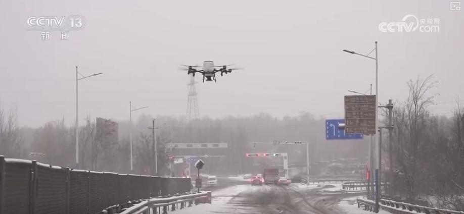 降雪致交通受阻 無人機(jī)大型機(jī)械撒鹽除雪