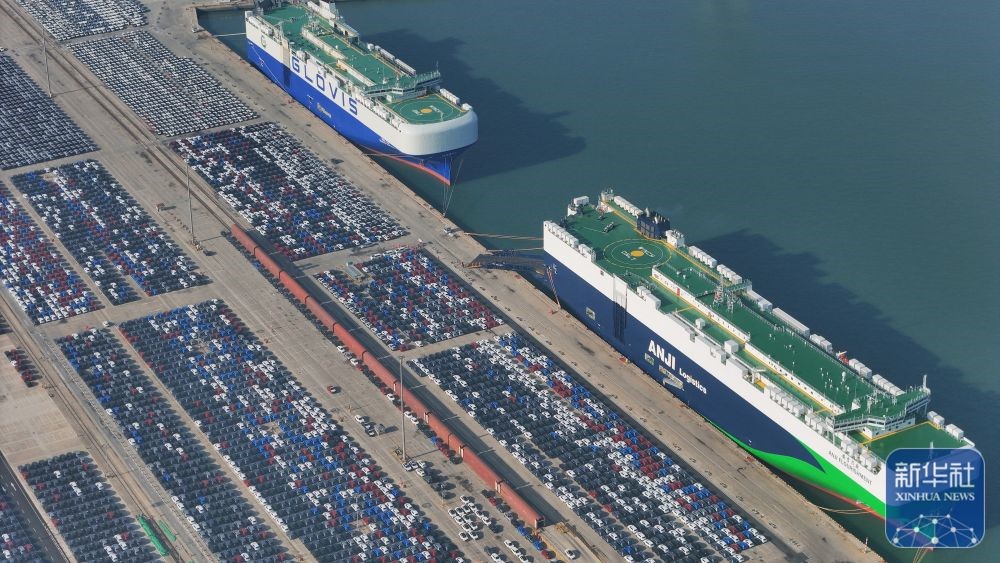 ↑ 12月15日,國(guó)產(chǎn)汽車在山東港口煙臺(tái)港集結(jié)等待裝船出口(無(wú)人機(jī)照片)。新華社發(fā)(唐克攝)