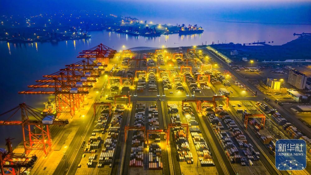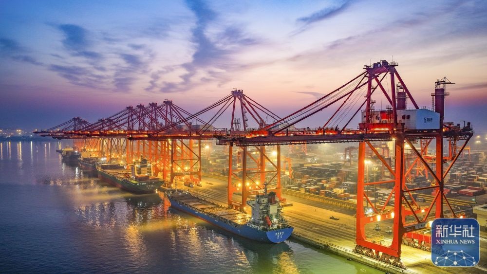↑ 12月15日,在山東港口青島港,貨輪在裝卸外貿(mào)集裝箱(無(wú)人機(jī)照片)。新華社發(fā)(俞方平攝)