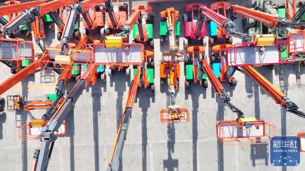 ↑ 12月15日,在位于浙江省湖州市德清縣雷甸鎮(zhèn)的浙江鼎力機(jī)械股份有限公司,工人對(duì)準(zhǔn)備出口的新臂式智能高空作業(yè)平臺(tái)設(shè)備進(jìn)行檢測(cè)(無(wú)人機(jī)照片)。新華社發(fā)(謝尚國(guó)攝)