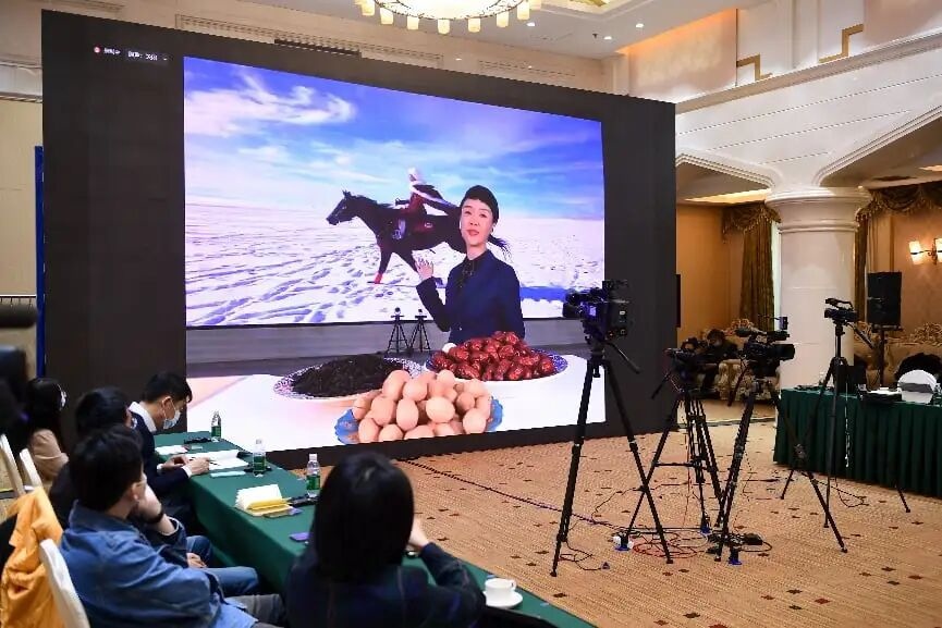 2022年3月17日,新疆維吾爾自治區(qū)人民政府在北京舉辦涉疆新聞發(fā)布會,并在會上視頻連線賀嬌龍,請她介紹帶領(lǐng)民眾通過直播帶貨增收的情況。 中新社記者 田雨昊 攝
