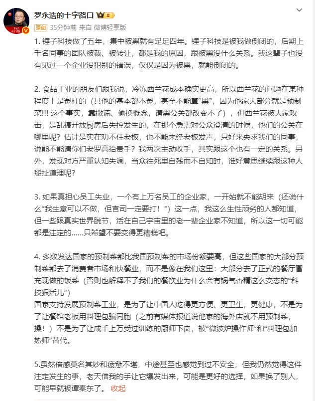 1月16日,@羅永浩的十字路口 再次發(fā)長(zhǎng)文回應(yīng)西貝賈國(guó)龍近日的言論。他表示,錘子科技做了五年,集中被黑就有足足四年。錘子科技是被我做倒閉的,后期上千名同事的團(tuán)隊(duì)被裁、被轉(zhuǎn)讓,都是我的原因,跟被黑沒什么關(guān)系。我這輩子也沒有見過一個(gè)企業(yè)沒犯別的錯(cuò)誤,僅僅是因?yàn)楸缓?,就能倒閉的。