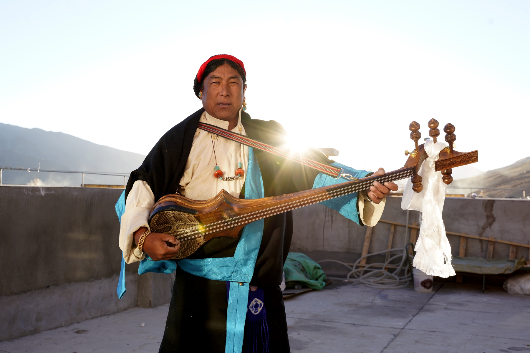 拍攝日,陽(yáng)光清澈,天空湛藍(lán)。村民們穿上了最隆重的藏裝,女人發(fā)間的珊瑚與綠松石流淌著溫潤(rùn)的光澤。許多老人被子女小心攙扶而來,他們的眼神里有局促,有陌生,也有隱約的期待。
