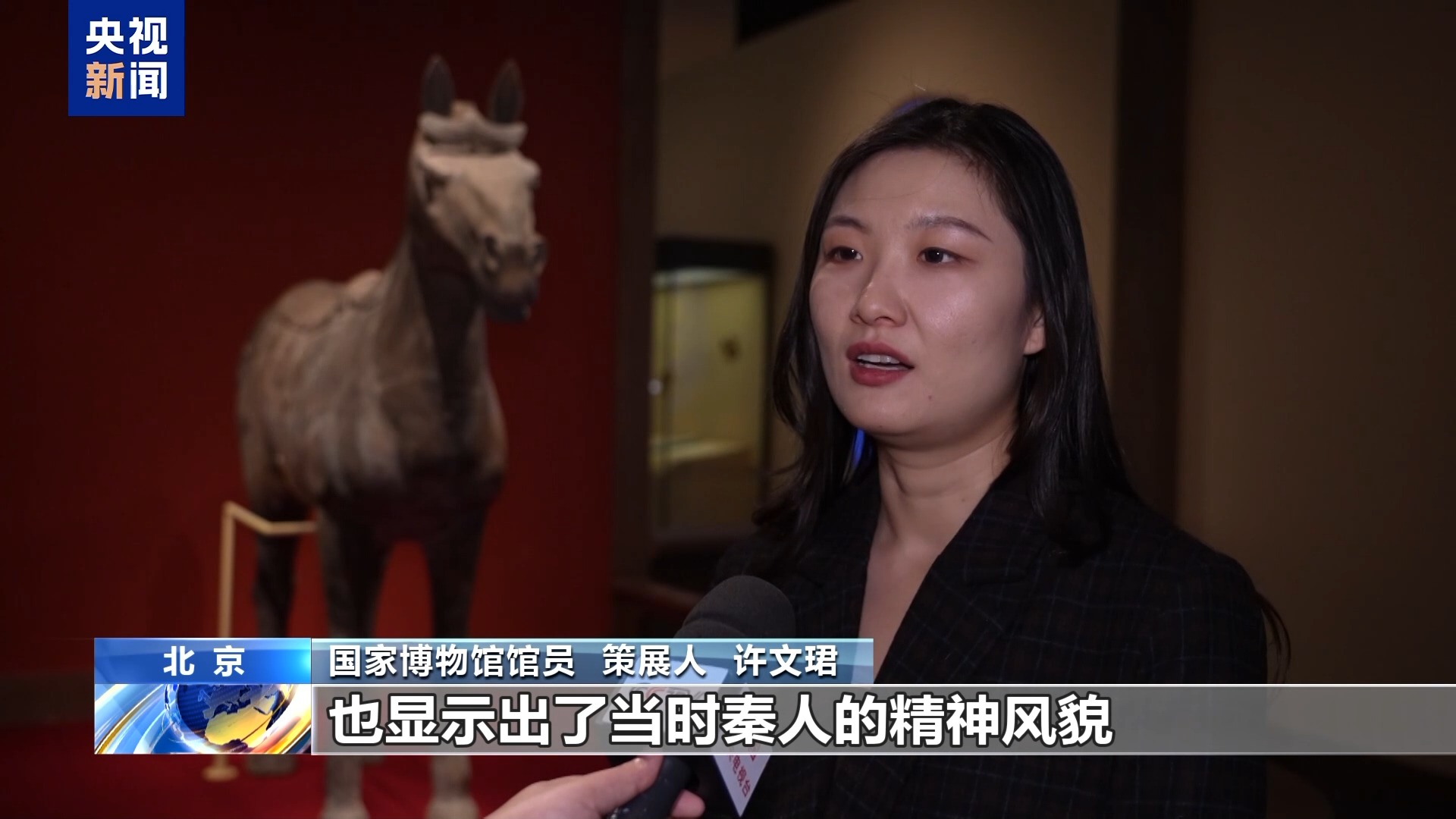 國家博物館館員、策展人 許文珺:這一件秦始皇帝陵兵馬俑的秦鞍馬,雙蹄直立,它的耳朵是直立的,尾巴也是梳成一個辮狀,整體非常有力量,也是秦代人對戰(zhàn)馬篩選標準非常嚴格的體現(xiàn),也顯示出了當時秦人的一個精神風貌。