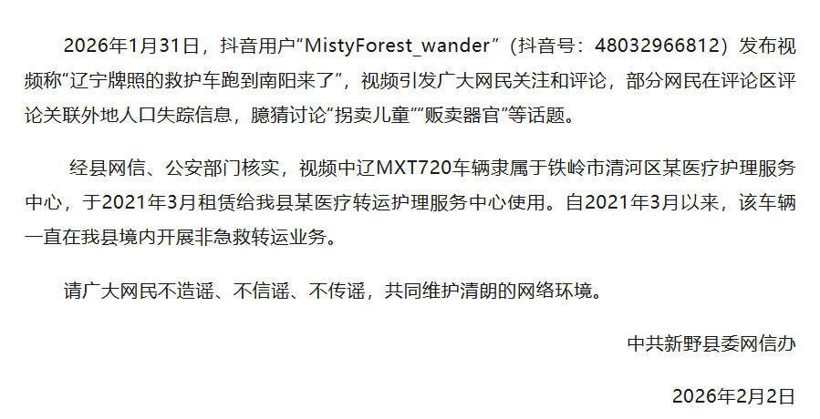 中國(guó)網(wǎng)2月2日訊 據(jù)“新野發(fā)布”微信公眾號(hào)消息,2月2日上午,河南省南陽(yáng)市新野縣委網(wǎng)信辦發(fā)布情況說(shuō)明稱,2026年1月31日,抖音用戶“MistyForest_wander”(抖音號(hào):48032966812)發(fā)布視頻稱“遼寧牌照的救護(hù)車(chē)跑到南陽(yáng)來(lái)了”,視頻引發(fā)廣大網(wǎng)民關(guān)注和評(píng)論,部分網(wǎng)民在評(píng)論區(qū)評(píng)論關(guān)聯(lián)外地人口失蹤信息,臆猜討論“拐賣(mài)兒童”“販賣(mài)器官”等話題。