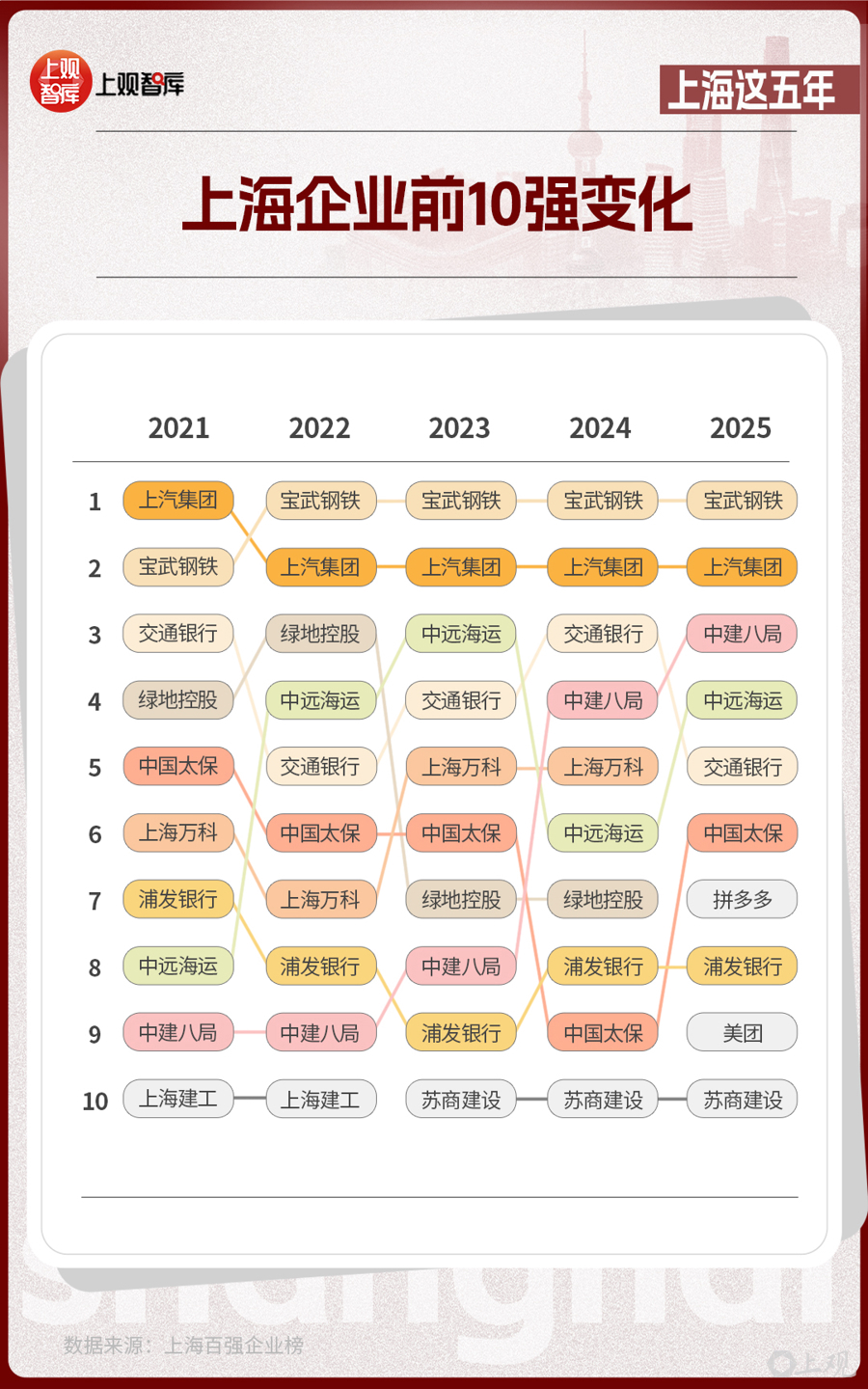 這份由上海市企業(yè)聯(lián)合會(huì)、上海市企業(yè)家協(xié)會(huì)、上海市經(jīng)濟(jì)團(tuán)體聯(lián)合會(huì)和解放日?qǐng)?bào)社共同發(fā)布的榜單,從2021年到2025年,見(jiàn)證了傳統(tǒng)企業(yè)的轉(zhuǎn)型與創(chuàng)新企業(yè)的涌現(xiàn)。在前10強(qiáng)的名單中,制造業(yè)仍然是上海產(chǎn)業(yè)的壓艙石,而房地產(chǎn)、建筑企業(yè)從2021年占比達(dá)40%,到2025年占比降低為20%?;ヂ?lián)網(wǎng)企業(yè)在2025年沖上前10強(qiáng),并占據(jù)了20%的席位,亮出了上海經(jīng)濟(jì)多元發(fā)展的成績(jī)單。