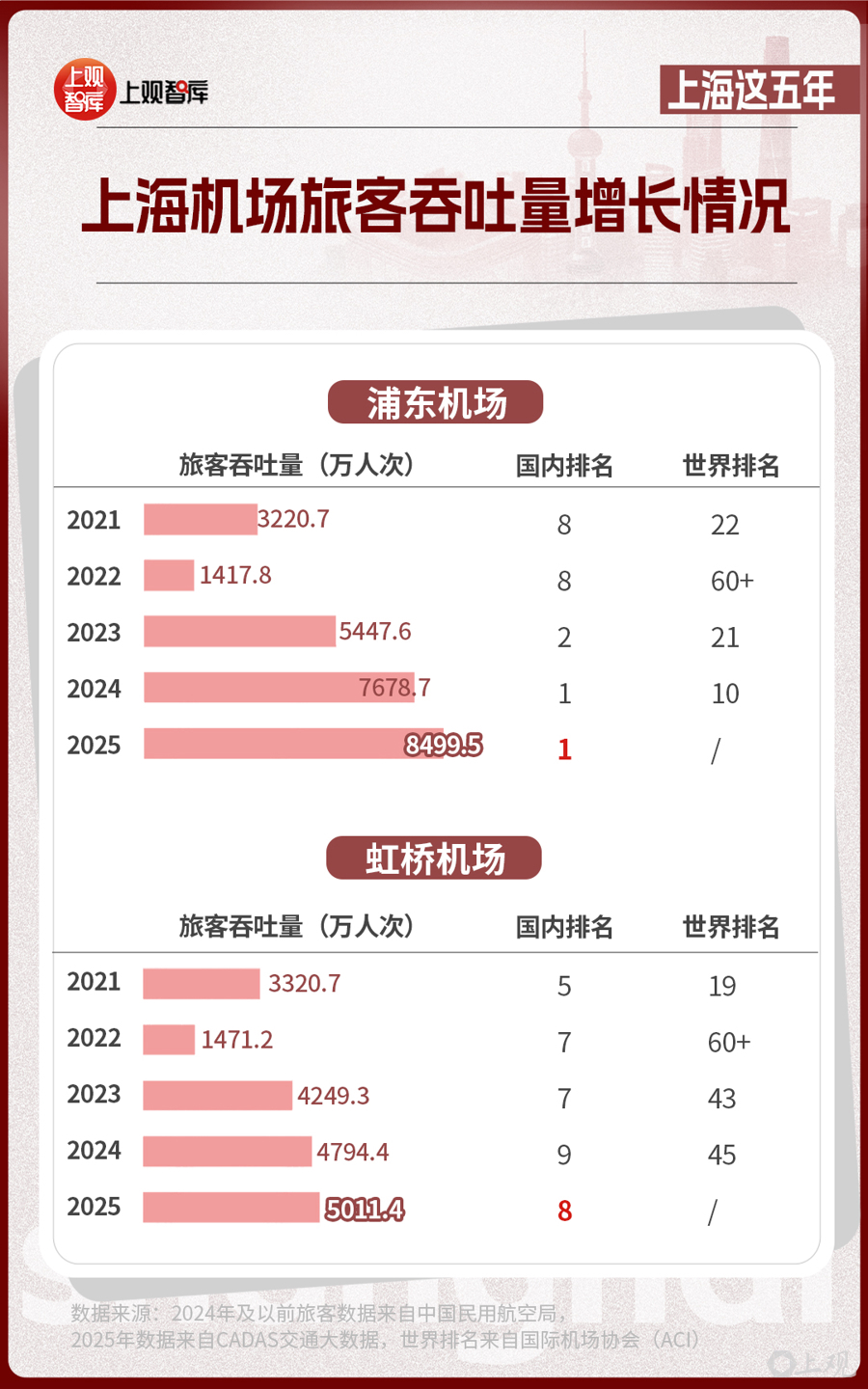 2024年,上海浦東國(guó)際機(jī)場(chǎng)首次排名全國(guó)旅客吞吐量第一,榮登中國(guó)最繁忙的機(jī)場(chǎng)。也是在這一年,上海港成為全球首個(gè)年吞吐量超過(guò)5000萬(wàn)標(biāo)準(zhǔn)箱的世界大港。