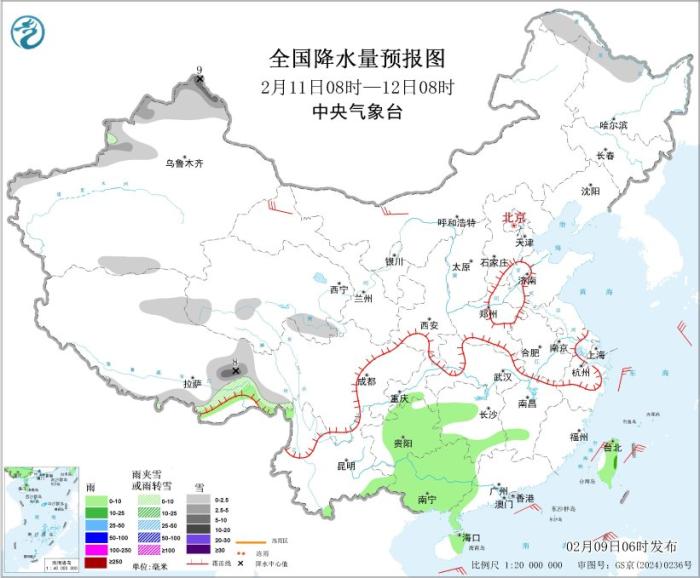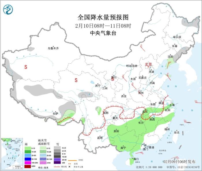 2月9日08時(shí)至10日08時(shí),新疆西北部、西藏東北部和南部、青海北部、甘肅河西、山西中南部、山東大部、湖北西部、湖南西北部、重慶東北部等地部分地區(qū)有小雪或雨夾雪,局地有中雪;貴州東北部、湖南西部等地高海拔山區(qū)有凍雨。江漢東部、江淮、江南及重慶東南部、貴州大部、廣西中部和北部、云南南部、海南島東部、臺灣島東部等地部分地區(qū)有小雨。新疆東部和南部、青海中東部、內(nèi)蒙古中西部、甘肅中西部、寧夏、陜西北部等地的部分地區(qū)有揚(yáng)沙或浮塵天氣,局地有沙塵暴。新疆北疆東部和南疆山區(qū)、內(nèi)蒙古西部、青海大部、甘肅河西、寧夏大部、西藏西部和北部、川西高原北部等地有5~7級風(fēng)、陣風(fēng)8~9級;東海南部海域、臺灣海峽、臺灣以東洋面、巴士海峽、南海大部海域、瓊州海峽、北部灣將有7~8級、陣風(fēng)9級的大風(fēng),其中,巴士海峽、南海東部海域的部分海域風(fēng)力可達(dá)9級、陣風(fēng)10級(見圖2)。