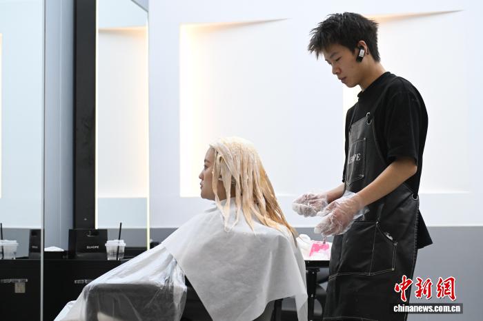 理發(fā)師為年輕顧客染發(fā)。 中新網記者 劉文華 攝