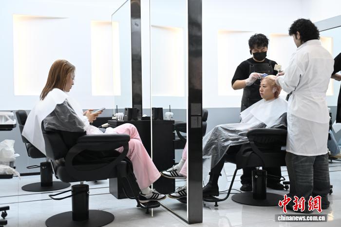 在等候區(qū),“00后”女生王佳正在和發(fā)型師溝通一個大膽的想法。她想嘗試一款色彩鮮艷的創(chuàng)意染發(fā)。