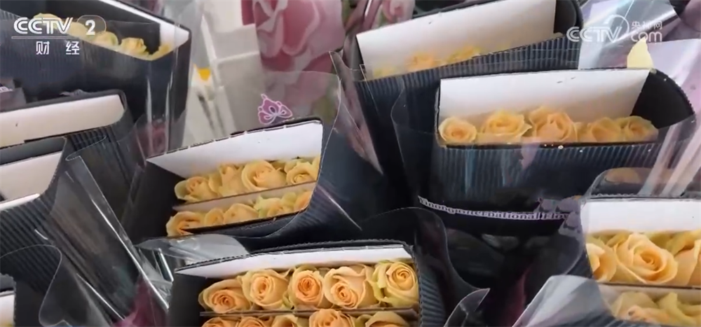 商家介紹,本月出口鮮花的發(fā)貨量是日常的五倍,目前訂單已經(jīng)排到年后。新鮮采摘的鮮花在出口商車(chē)間完成分揀、包裝、保鮮等處理后,由冷鏈送往機(jī)場(chǎng)過(guò)關(guān)出口,整個(gè)流程最快不到20小時(shí)就能完成。