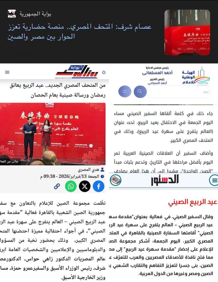 當?shù)貢r間2月13日,“春晚序曲 全球看春晚”埃及專場活動在開羅舉行。本次活動由中國中央廣播電視總臺與中國駐埃及大使館、埃及旅游和文物部、埃及旅游促進局共同主辦。中宣部副部長、中央廣播電視總臺臺長慎海雄作視頻致辭。中國駐埃及大使兼駐阿盟全權(quán)代表廖力強,埃及政府代表、埃及外交部亞洲事務(wù)部助哈姆扎,埃及前總理沙拉夫出席活動并致辭。埃及考古學(xué)家、前文物部長哈瓦斯,埃及旅游促進局主席代拉提芙,埃及外交事務(wù)委員會執(zhí)行主任伊扎特,巴德爾大學(xué)副校長巴斯歐尼,阿盟非洲事務(wù)司司長布斯坦吉,阿盟理事會秘書處主任法赫米等中埃兩國政界、學(xué)術(shù)界、媒體界代表200余名嘉賓參加活動。