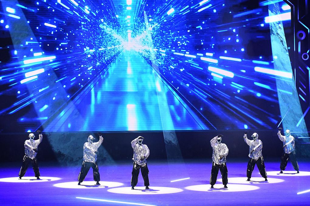 在開場(chǎng)節(jié)目《萬馬奔騰》中,20臺(tái)機(jī)械臂與26臺(tái)雙臂機(jī)器人齊揮鼓槌,激昂鼓聲奏出奮進(jìn)節(jié)拍。