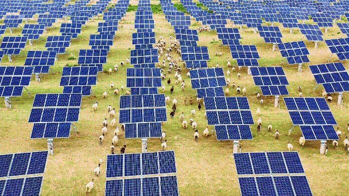 短短數(shù)年,塔拉灘上豎起了一排排整齊劃一的光伏板,更令人驚喜的是,光伏板下的沙地漸漸換上了“綠裝”——耐陰耐旱的牧草茁壯成長,羊群在板間悠然覓食,一幅綠電與生態(tài)共生的活力圖景徐徐展開。