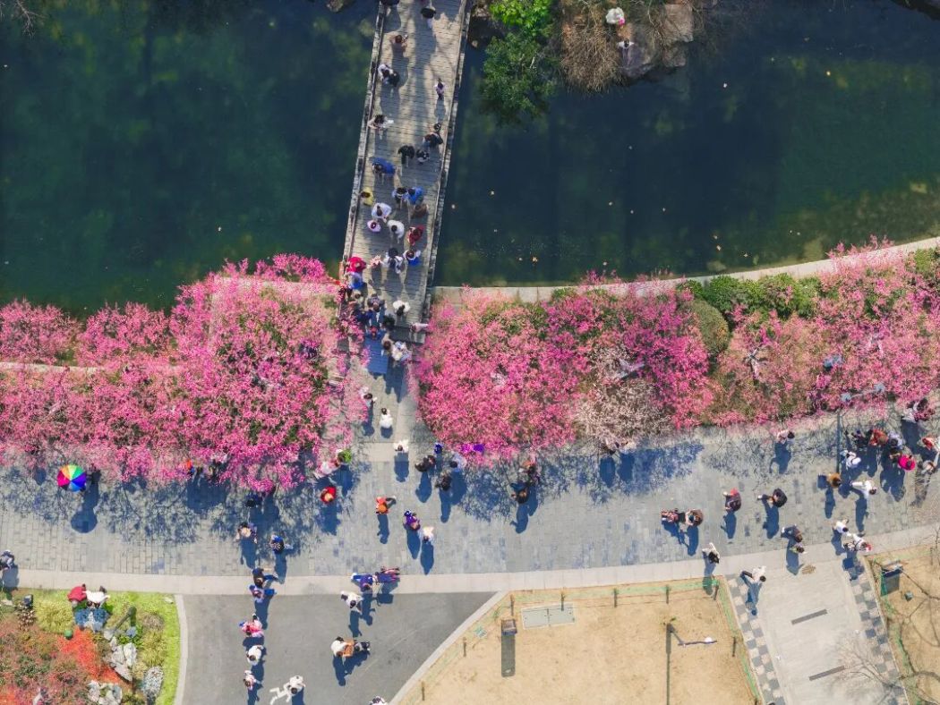 在江南水鄉(xiāng),早春的序曲總是由梅花奏響。江蘇常州便是這抹春色里最具代表性的剪影。龍城正月,古運(yùn)河畔紅燈籠高掛,紅梅公園內(nèi),唐代紅梅閣翹角飛檐,閣前紅梅燦若云霞,恰如趙翼詩(shī)中所繪的盛景。這里的賞梅,早已不是單純的游園,而是一場(chǎng)雅俗共賞的年俗盛會(huì)。文旅IP“常寶"穿梭送福,打卡點(diǎn)紅燈籠高懸,大年初一的市集上,手作、梅花好物琳瑯滿(mǎn)目,糖畫(huà)、梅花酥香氣四溢,文筆塔的花瀑氛圍拉滿(mǎn),市民在梅香與煙火氣中收獲新春幸福。