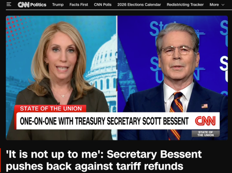 當(dāng)?shù)貢r間2月22日,美國財政部長斯科特·貝森特在接受美國有線電視新聞網(wǎng)(CNN)采訪時,被主持人達娜·巴什追問著一個看似直接、卻難以直接回答的問題:既然最高法院已裁定特朗普政府依據(jù)《國際緊急經(jīng)濟權(quán)力法》(IEEPA)征收的大范圍“緊急關(guān)稅”缺乏授權(quán),那么此前收上來的巨額關(guān)稅款,退不退、怎么退?