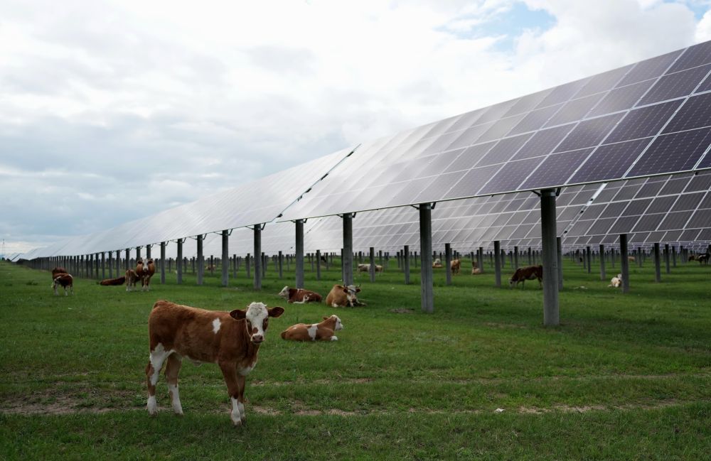 牛群在河北省圍場滿族蒙古族自治縣御道口鎮(zhèn)附近的一處“牧光互補(bǔ)”光伏發(fā)電場吃草(2024年7月25日攝)。新華社記者 楊世堯 攝