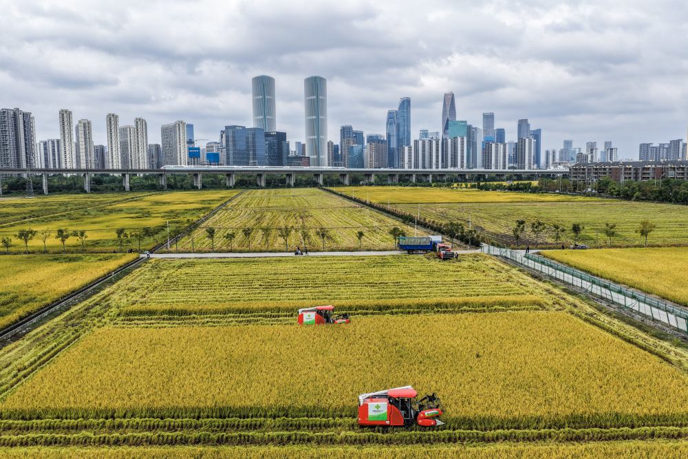 2025年10月21日,在浙江杭州蕭山區(qū),收割機(jī)在稻田里收割水稻,遠(yuǎn)處高鐵列車飛馳而過(無人機(jī)照片)。新華社記者 徐昱 攝