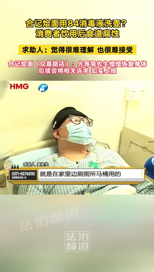 彼時,鄭州合記燴面眾意路店負(fù)責(zé)人接受媒體采訪時表示,店里平時不允許這樣做,服務(wù)員為了圖省事,私自將原本用作打掃衛(wèi)生的84消毒液,滴了一滴清洗水壺,另一名服務(wù)員在不知情的情況下拎上了餐桌。
