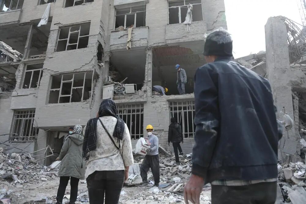 3月12日,在伊朗首都德黑蘭,市民站在建筑廢墟前。新華社記者 沙達(dá)提 攝