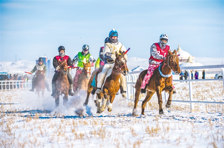 1月18日,錫林浩特市那達慕風情園內馬蹄踏雪、人聲鼎沸,“歌游內蒙古·暢享錫林浩特”——冬季那達慕暨蒙古馬超級聯賽在歡騰的歌聲中拉開序幕。開幕式上,隨著馬蹄的噠噠聲,一支雄壯的馬隊踏雪而來,騎手們身著艷麗的蒙古袍,駕馭著矯健的蒙古馬,以整齊的隊列自遠處緩緩走來。歌聲悠揚,舞姿豪邁,演員們以動人的演繹,完美詮釋了力量與藝術之美。本次賽事包含15公里耐力賽、10公里3人團體接力賽、跑馬射箭、跑馬拾哈達、6公里走馬及搏克比賽等比賽項目。賽場上,騎手們馭馬飛馳,人與馬默契配合,在銀裝素裹的雪原上縱橫馳騁。在跑馬射箭與跑馬拾哈達項目上,騎手在飛奔的馬匹上挽弓搭箭、俯身拾物,動作行云流水,精湛技藝引來觀眾陣陣驚呼與贊嘆。除了扣人心弦的比賽,本次活動還為游客打造了豐富的冰雪互動體驗。冰雪涮肉宴香氣四溢,草原篝火電音派對將熱情推向高潮,千人雪戰(zhàn)、雪地拔河等趣味項目讓游客親身參與,盡情享受冰雪樂趣?,F場還同步舉辦了錫林浩特“伊德喜”草原冬儲肉展銷活動,讓游客在觀賽之余,還能選購到正宗錫林郭勒牛羊肉,體驗純正的草原風味。(記者
