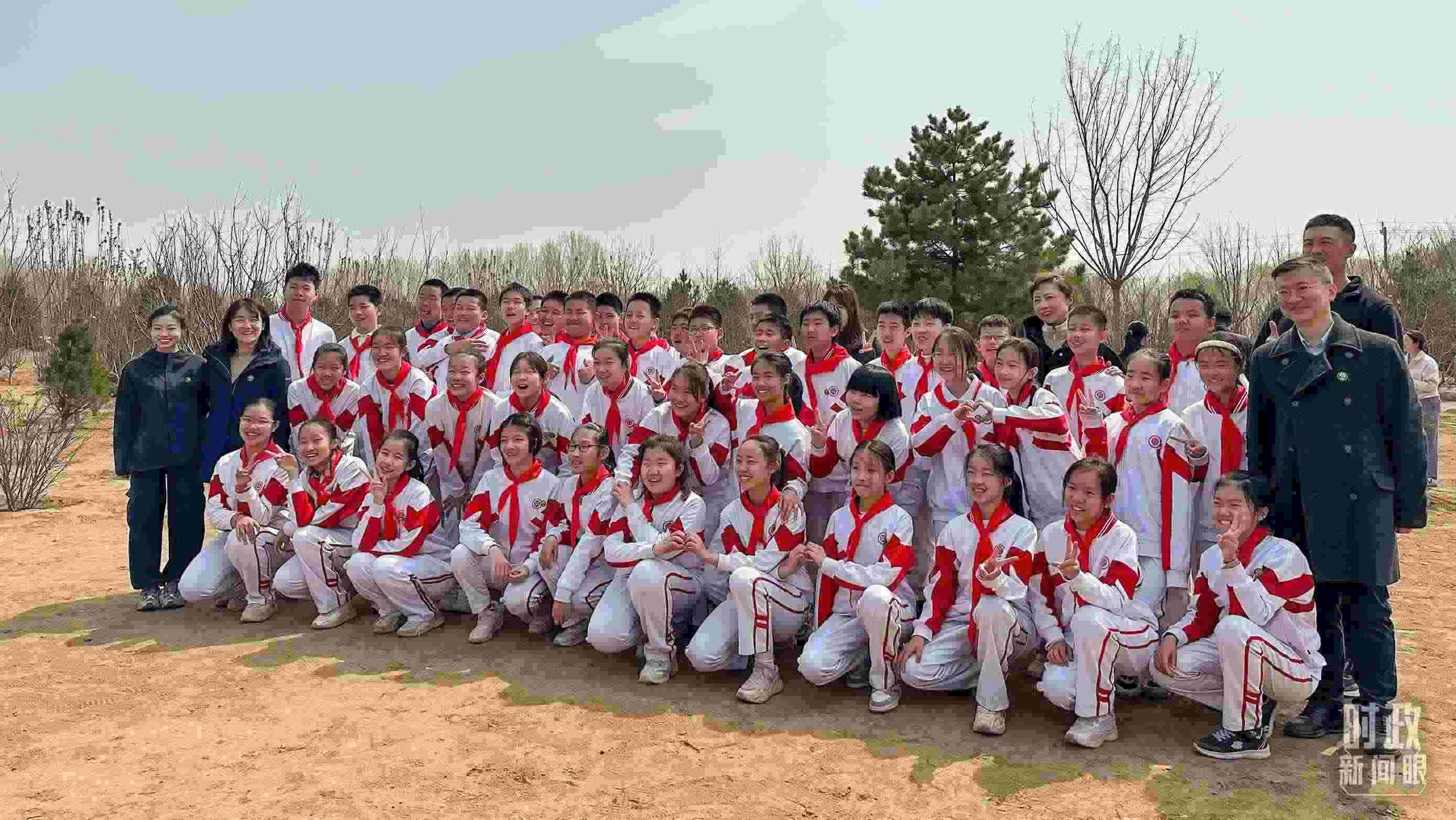 △現(xiàn)場(chǎng)參加植樹(shù)的少先隊(duì)員們。(總臺(tái)央視記者鄂介甫拍攝)