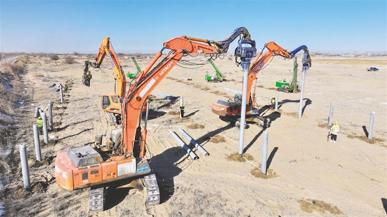 引孔機、打樁機轟鳴聲不絕于耳,打樁機將一根根水泥樁“釘”入地面中……連日來,巴彥淖爾市臨河區(qū)新華林場防沙治沙和光伏一體化項目施工現場多臺作業(yè)車輛同時進行樁基作業(yè),現場還不時有工作人員對打樁等基礎工作進行抽檢抽查,確保施工質量。