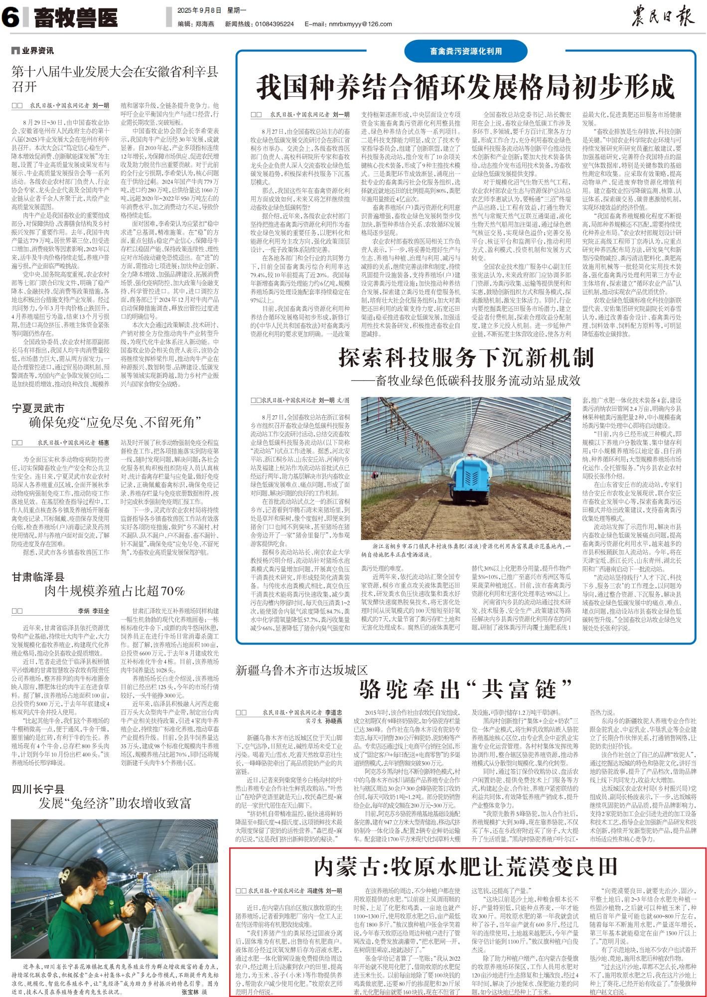 2025年9月8日,《農(nóng)民日報》第6版整版刊發(fā)題為《內(nèi)蒙古:牧原水肥讓荒漠變良田》的文章,報道了在內(nèi)蒙古奈曼旗的牧原養(yǎng)殖場環(huán)保區(qū),工作人員用水肥對120畝沙地進行生態(tài)修復(fù)和土壤改良,經(jīng)過4年時間,解決了沙地保水、保肥能力差的問題,如今這塊地已經(jīng)種上了玉米。