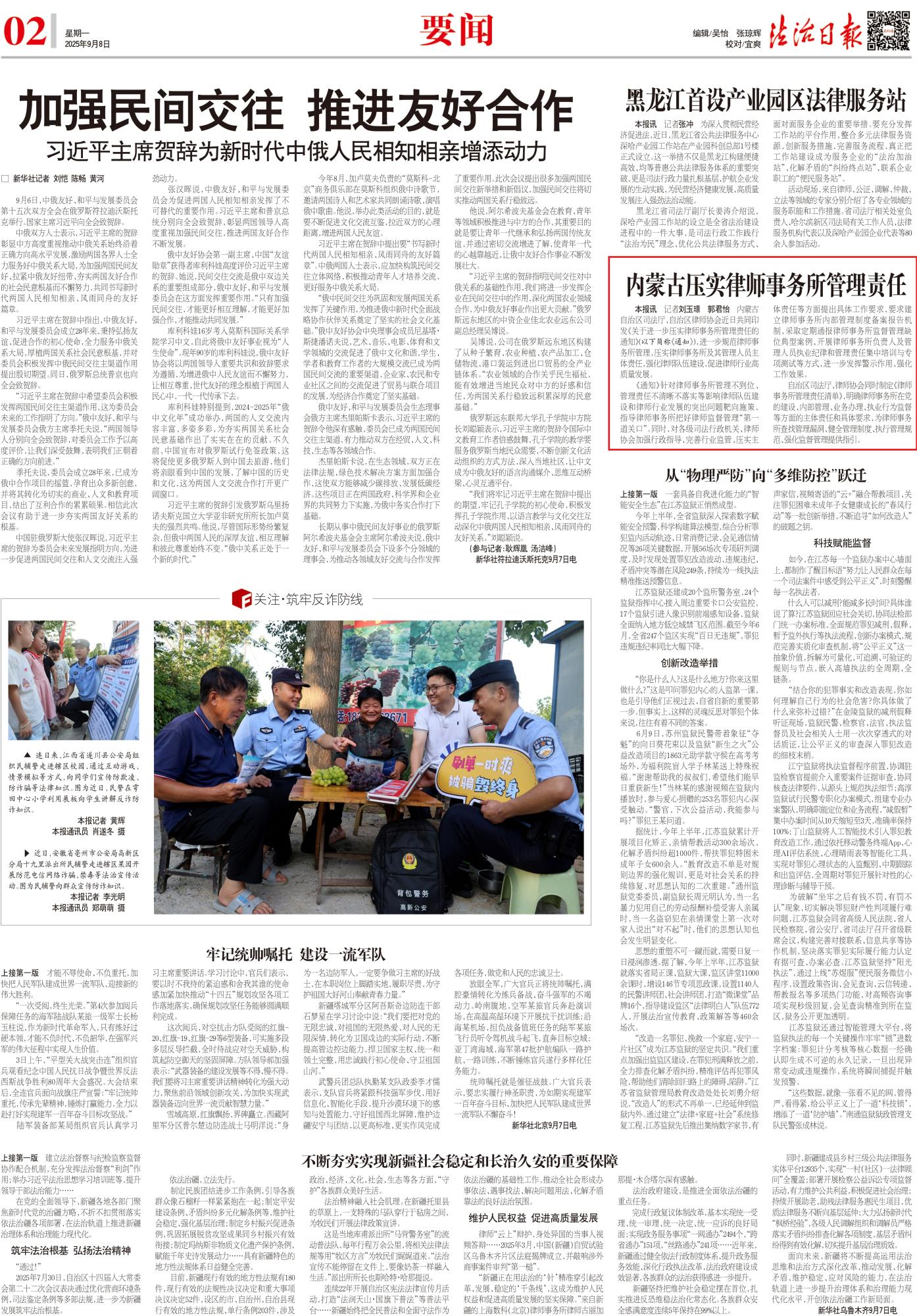 2025年9月8日,《法治日?qǐng)?bào)》第2版整版刊發(fā)題為《內(nèi)蒙古壓實(shí)律師事務(wù)所管理責(zé)任》的文章,報(bào)道了內(nèi)蒙古自治區(qū)司法廳、自治區(qū)律師協(xié)會(huì)近日共同印發(fā)《關(guān)于進(jìn)一步壓實(shí)律師事務(wù)所管理責(zé)任的通知》,進(jìn)一步規(guī)范律師事務(wù)所管理,壓實(shí)律師事務(wù)所及其管理人員主體責(zé)任,強(qiáng)化律師隊(duì)伍建設(shè),促進(jìn)律師行業(yè)高質(zhì)量發(fā)展。