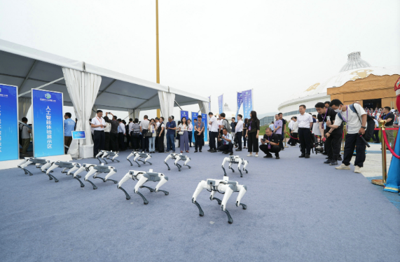 7月12日,2025綠色算力大會(huì)在呼和浩特開幕,圖為工作人員通過鍵盤操控機(jī)器狗進(jìn)行表演。