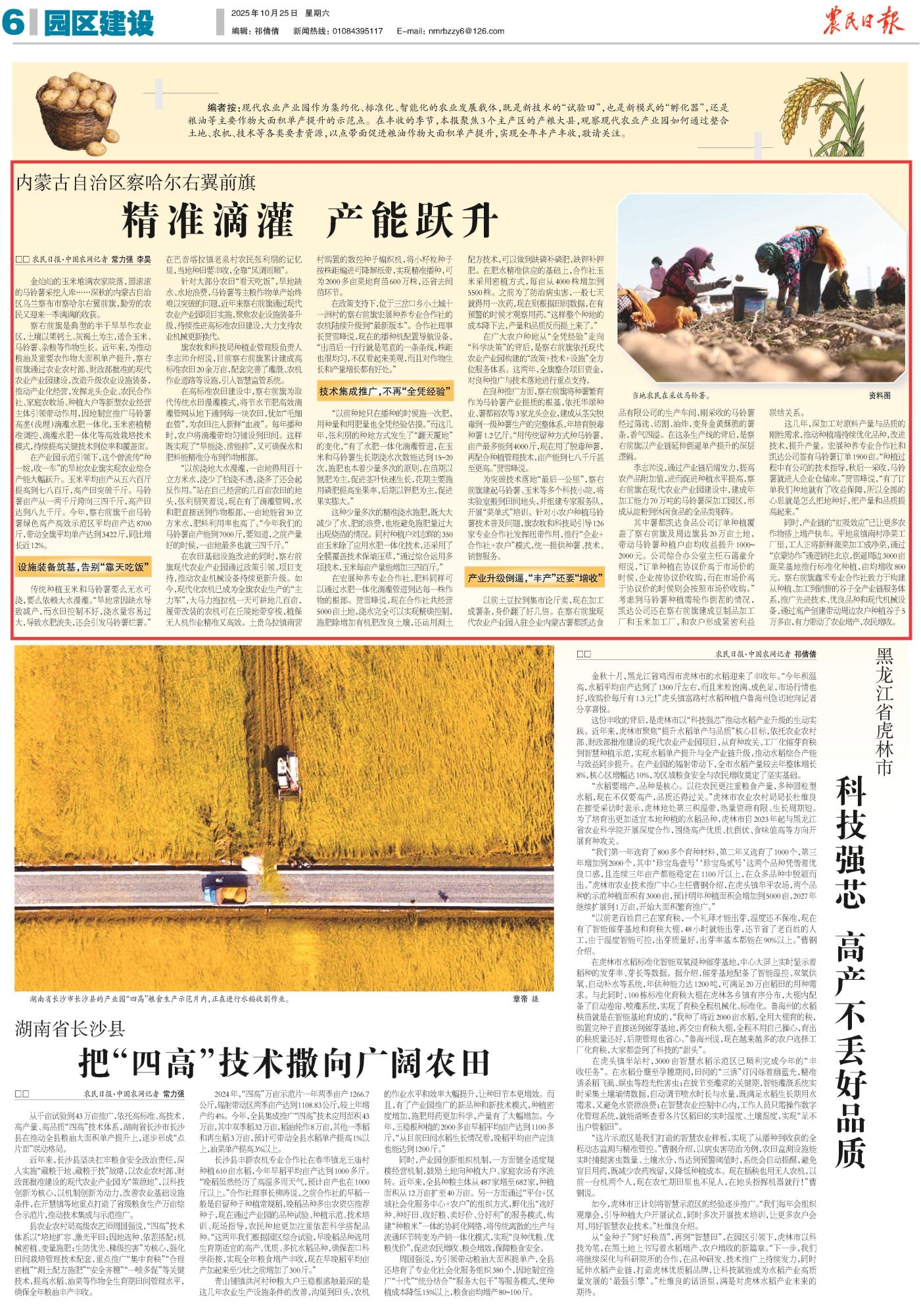 2025年10月25日,《農(nóng)民日?qǐng)?bào)》第6版刊發(fā)題為《內(nèi)蒙古自治區(qū)察哈爾右翼前旗:精準(zhǔn)滴灌 產(chǎn)能躍升》的文章,報(bào)道了內(nèi)蒙古烏蘭察布市察哈爾右翼前旗通過現(xiàn)代農(nóng)業(yè)產(chǎn)業(yè)園推廣滴灌水肥一體化等技術(shù),推動(dòng)玉米、馬鈴薯單產(chǎn)大幅提升,成功實(shí)現(xiàn)從“靠天吃飯”到科技增收的轉(zhuǎn)變。