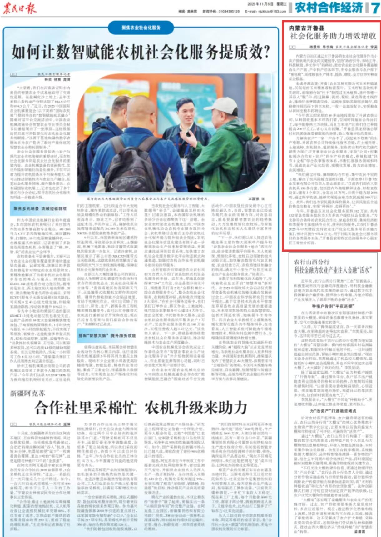 2025年11月5日,《農(nóng)民日報(bào)》第7版刊發(fā)題為《內(nèi)蒙古開魯縣:社會(huì)化服務(wù)助力增效增收》的文章,報(bào)道了今年以來,內(nèi)蒙古開魯縣玉米社會(huì)化服務(wù)面積182萬畝,共有132家各類服務(wù)組織為3萬多農(nóng)戶提供社會(huì)化服務(wù)。