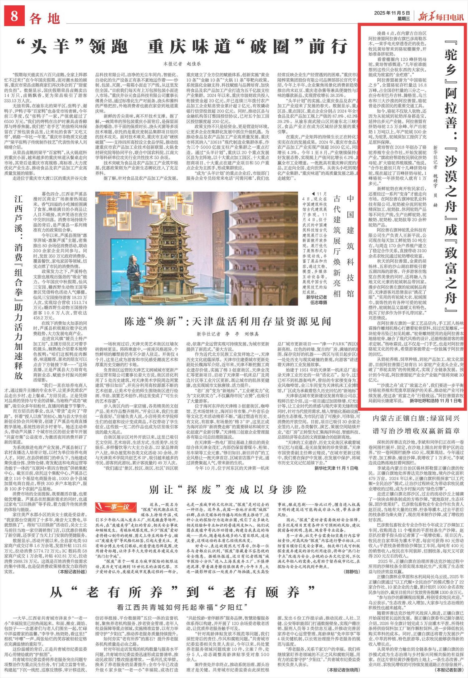 2025年11月5日,《新華每日電訊》第8版刊發(fā)題為《“駝鄉(xiāng)”阿拉善:“沙漠之舟”成“致富之舟”》的文章,報道了阿拉善盟被譽為“中國駱駝之鄉(xiāng)”,駱駝存欄量達16.8萬峰,占全國存欄量的三分之一。預(yù)計到今年底,阿拉善盟駝產(chǎn)業(yè)全產(chǎn)業(yè)鏈產(chǎn)值將突破30億元。