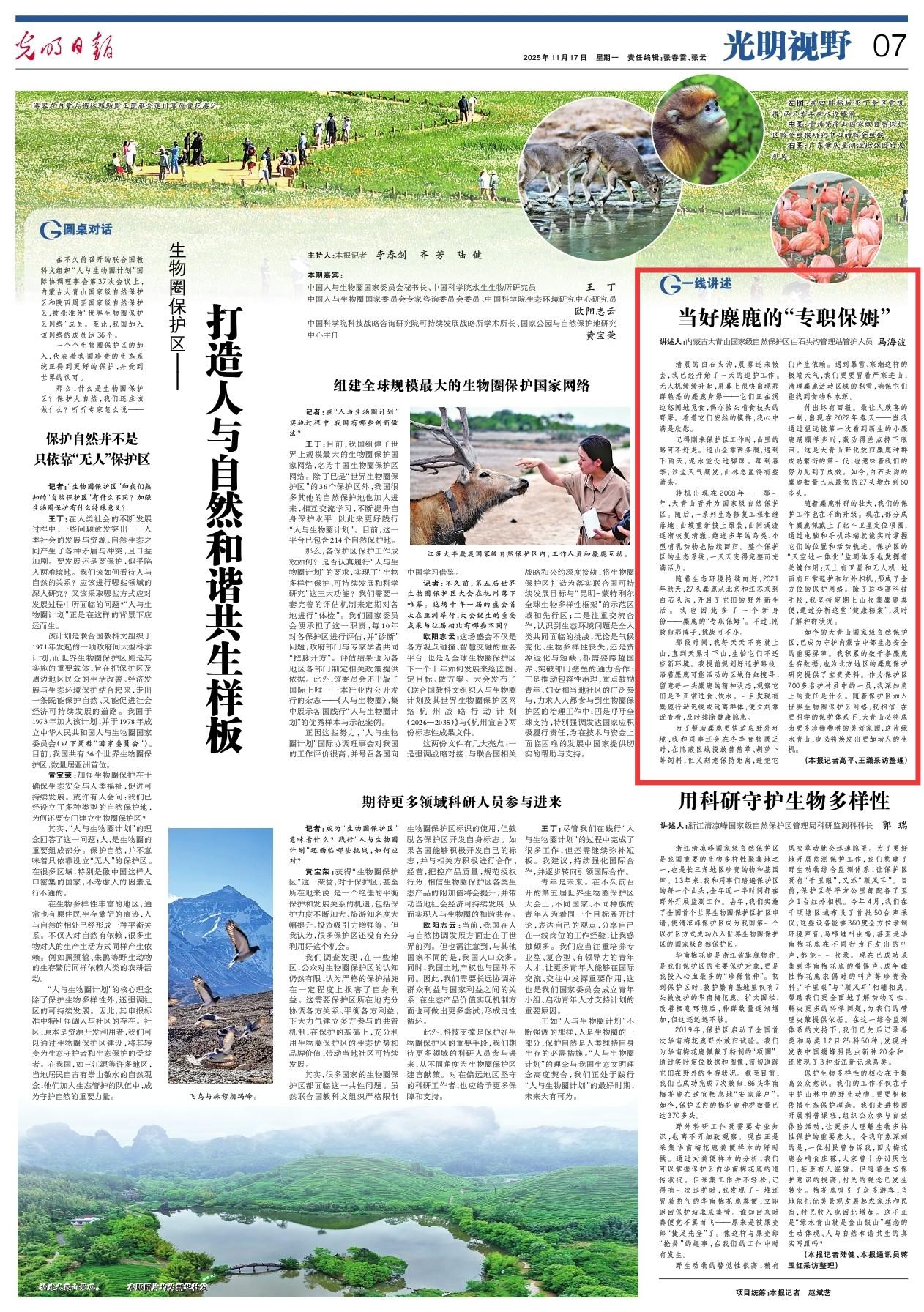 2025年11月17日,《光明日報》第7版刊發(fā)題為《當好麋鹿的“專職保姆”》的文章,以內蒙古大青山國家級自然保護區(qū)白石頭溝管理站管護人員馬海波的視角,講述當好麋鹿的“專職保姆”的故事,如今白石頭溝的麋鹿數(shù)量已從最初的27頭增加到60多頭。