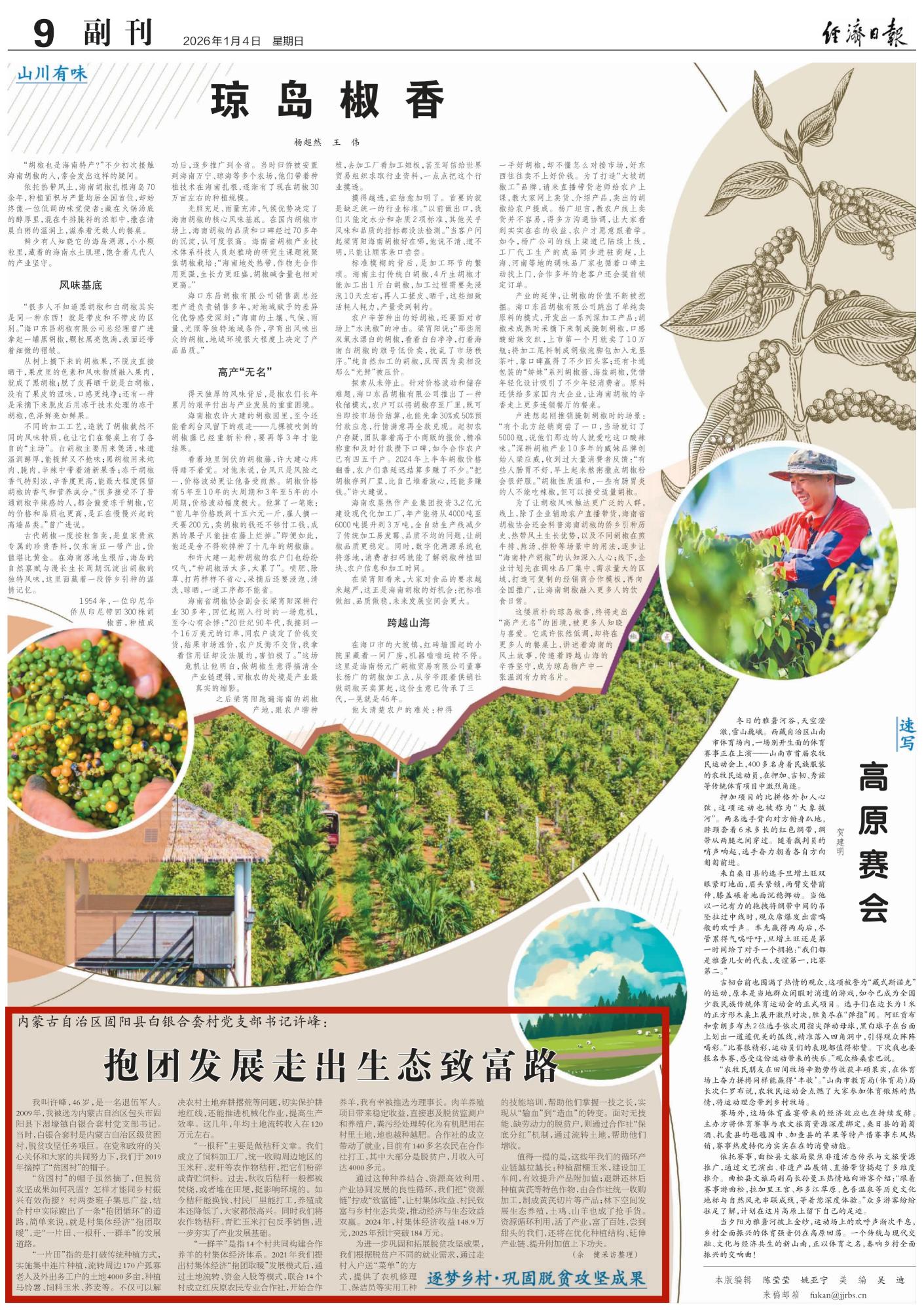 2026年1月4日,《經(jīng)濟(jì)日?qǐng)?bào)》第9版刊發(fā)題為《內(nèi)蒙古自治區(qū)固陽縣白銀合套村黨支部書記許峰:抱團(tuán)發(fā)展走出生態(tài)致富路》的文章,介紹了內(nèi)蒙古自治區(qū)固陽縣白銀合套村通過種養(yǎng)結(jié)合、資源高效利用、產(chǎn)業(yè)協(xié)同發(fā)展的良性循環(huán),把“資源鏈”擰成“致富鏈”,推動(dòng)經(jīng)濟(jì)與生態(tài)效益雙贏的做法。