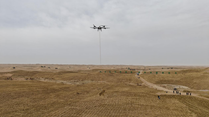 當(dāng)日上午10時(shí),在黃河“幾字彎”西岸的項(xiàng)目現(xiàn)場(chǎng),工程車輛整齊列隊(duì)蓄勢(shì)待發(fā),治沙工作者與建設(shè)人員精神抖擻,處處涌動(dòng)著起步即沖刺、實(shí)干勇爭(zhēng)先的奮斗熱潮。隨著響亮的“開工”令下,現(xiàn)場(chǎng)機(jī)械轟鳴,打樁機(jī)精準(zhǔn)作業(yè),無人機(jī)吊運(yùn)草料,手扶式沙障機(jī)忙著扎設(shè)草方格……阿拉善盟“十五五”時(shí)期生態(tài)建設(shè)的首場(chǎng)戰(zhàn)役——2026年“三北”六期工程攻堅(jiān)戰(zhàn)全面打響。