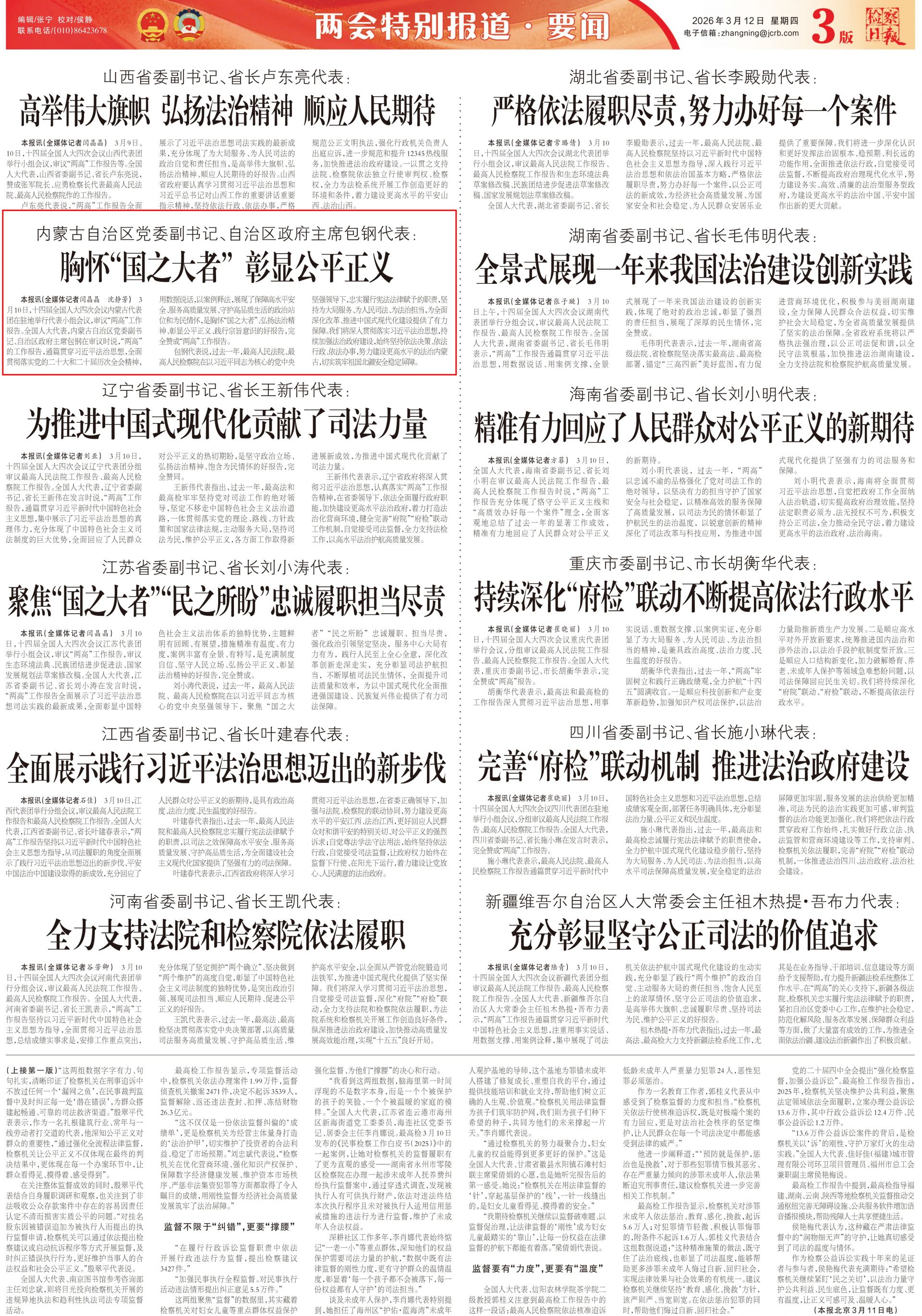 2026年3月11日《檢察日?qǐng)?bào)》第3版刊發(fā)了《內(nèi)蒙古自治區(qū)黨委副書記、自治區(qū)政府主席包鋼代表: 胸懷“國(guó)之大者” 彰顯公平正義 》的文章,報(bào)道了十四屆全國(guó)人大四次會(huì)議內(nèi)蒙古代表團(tuán)在駐地舉行代表小組會(huì)議,審議“兩高”工作報(bào)告。全國(guó)人大代表,內(nèi)蒙古自治區(qū)黨委副書記、自治區(qū)政府主席包鋼在審議時(shí)說(shuō),“兩高”的工作報(bào)告,通篇貫穿習(xí)近平法治思想,全面貫徹落實(shí)黨的二十大和二十屆歷次全會(huì)精神,用數(shù)據(jù)說(shuō)話,以案例釋法,展現(xiàn)了保障高水平安全、服務(wù)高質(zhì)量發(fā)展、守護(hù)高品質(zhì)生活的政治站位和為民情懷,是胸懷“國(guó)之大者”、弘揚(yáng)法治精神、彰顯公平正義、踐行宗旨意識(shí)的好報(bào)告,完全贊成“兩高”工作報(bào)告。