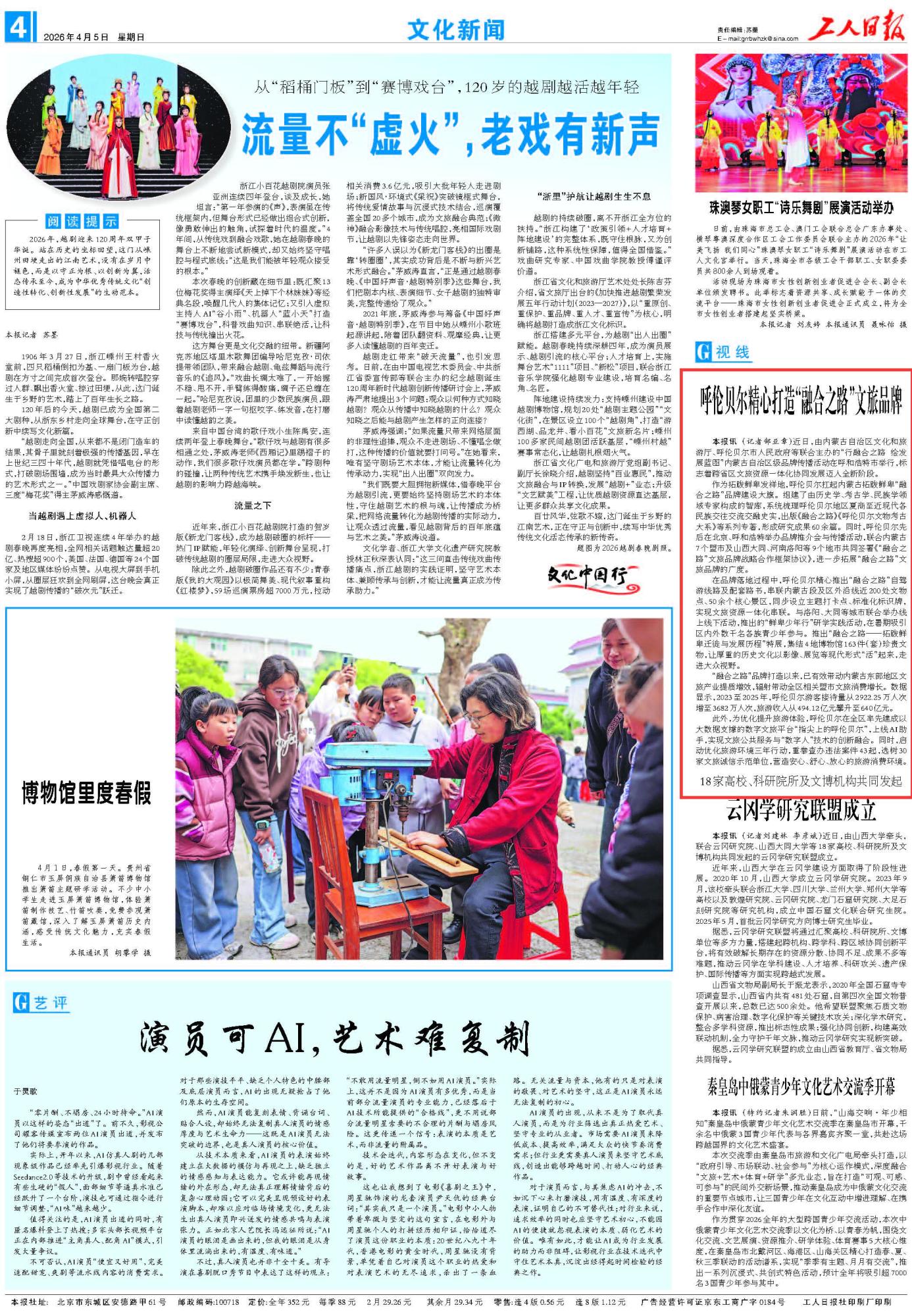 2026年4月5日《工人日報》第4版刊發(fā)了《呼倫貝爾精心打造“融合之路”文旅品牌》的文章,報道了由內(nèi)蒙古自治區(qū)文化和旅游廳、呼倫貝爾市人民政府等聯(lián)合主辦的“行融合之路 繪發(fā)展藍(lán)圖”內(nèi)蒙古自治區(qū)級品牌傳播活動在呼和浩特市舉行,標(biāo)志著跨省區(qū)文旅資源一體化協(xié)同發(fā)展邁入全新階段,有效帶動內(nèi)蒙古東部地區(qū)文旅產(chǎn)業(yè)提質(zhì)增效,輻射帶動全區(qū)相關(guān)盟市文旅消費增長。