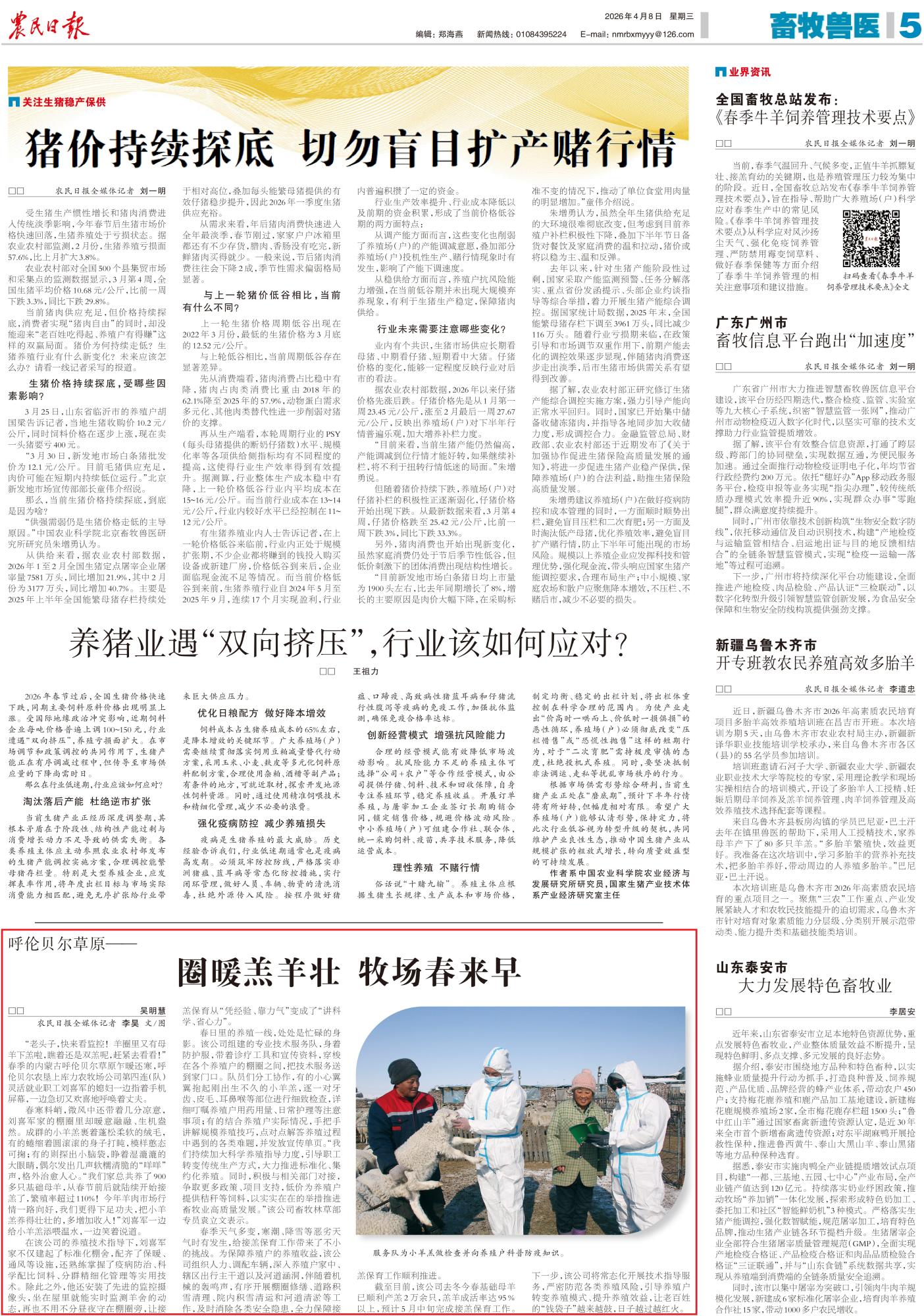 2026年4月8日,《農(nóng)民日報》第5版刊發(fā)題為《呼倫貝爾草原圈暖羔羊壯 牧場春來早》的文章,報道了春季天氣多變,寒潮、降雪等惡劣天氣時有發(fā)生,給接羔保育工作帶來了不小的挑戰(zhàn)。為保障養(yǎng)殖戶的養(yǎng)殖收益,呼倫貝爾農(nóng)墾上庫力農(nóng)牧場公司第四連(隊)組織人力、調(diào)配車輛,深入養(yǎng)殖戶家中、轄區(qū)出行主干道以及河道涵洞,有序開展棚圈修繕、道路積雪清理、院內(nèi)積雪清運和河道清淤等工作,及時消除各類安全隱患,全力保障接羔保育工作順利推進(jìn)。