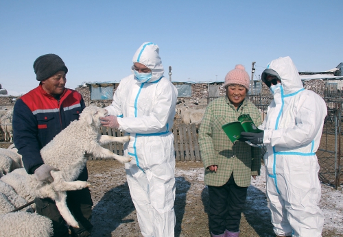 服務(wù)隊為小羊羔做檢查并向養(yǎng)殖戶科普防疫知識。